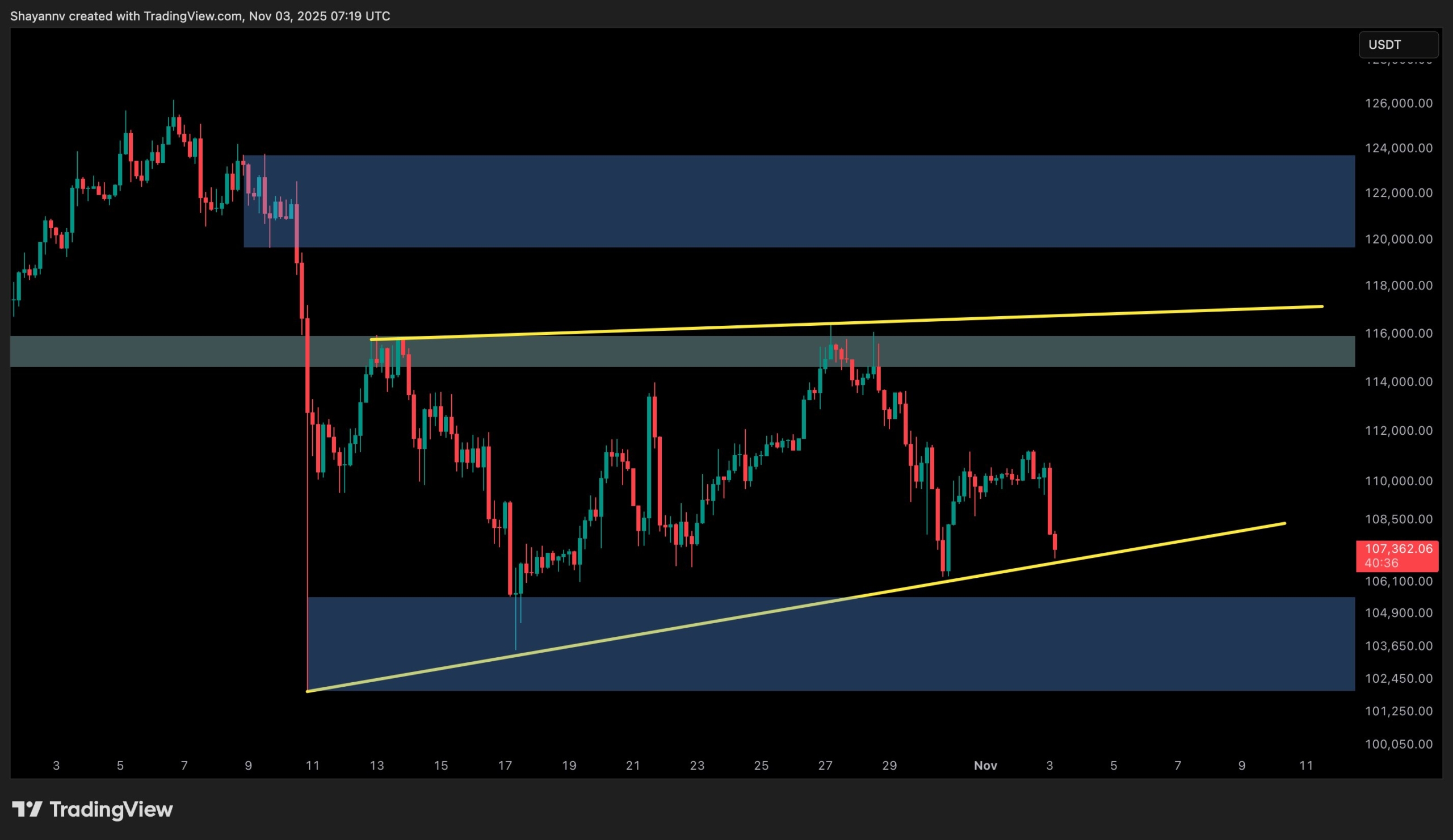 The 4-hour chart highlights the current ascending wedge formation, with BTC retesting the lower trendline near the $106,000 support zone.