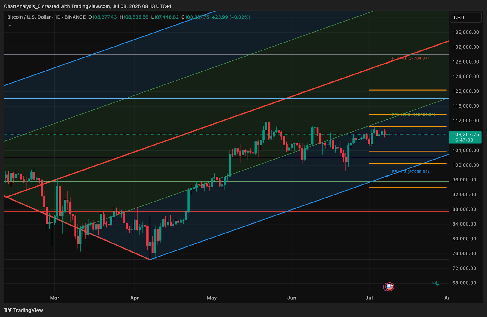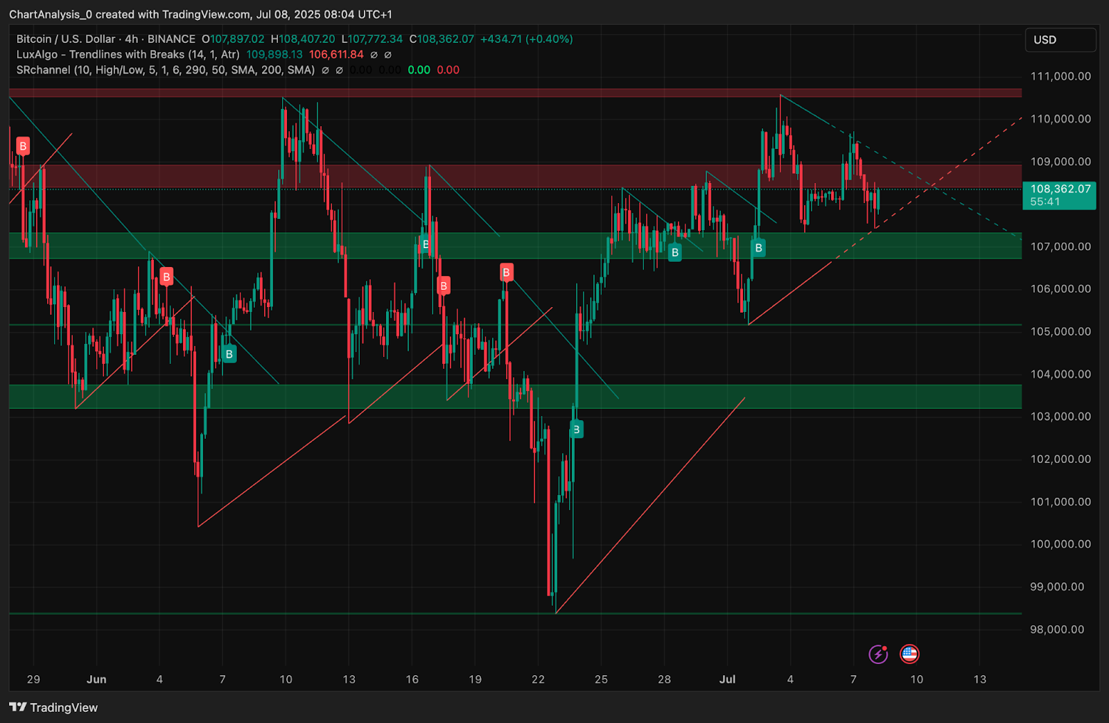 On July 9th, Bitcoin prices could continue to vibrate within the $107,000-$110,500 band unless the volume rises decisively. If the Bulls are able to close four-hour candles over $109,250 with confirmation, the next target will be $111,200, followed by a $114,000 channel top.