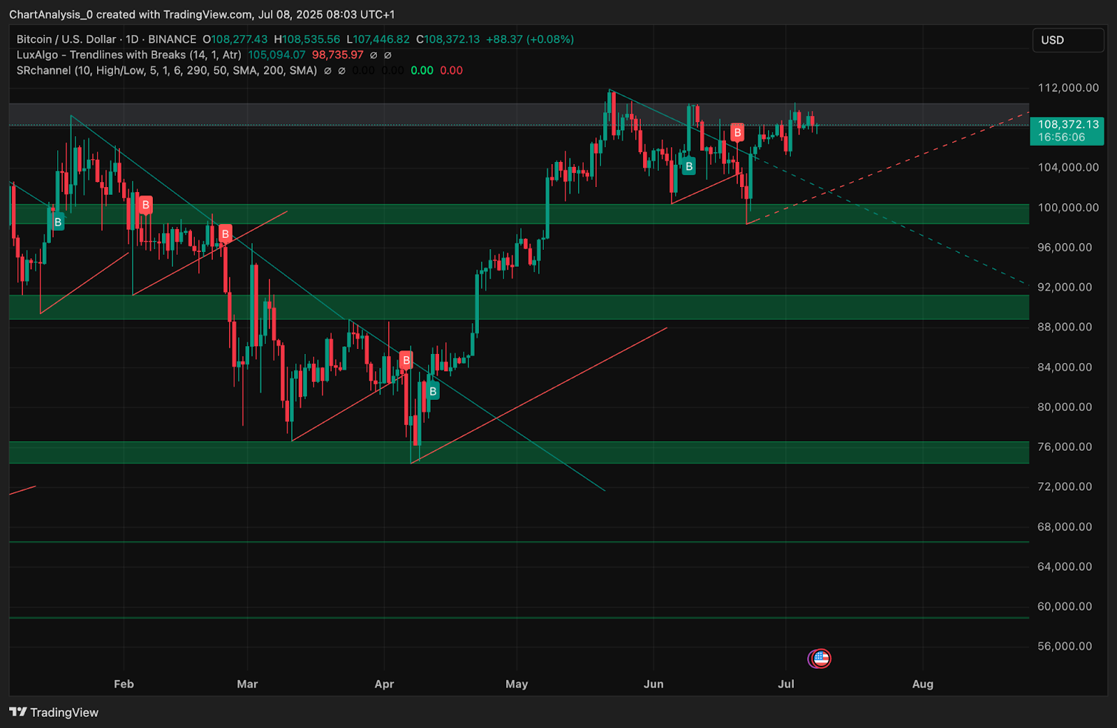 However, if you don't keep up with $107,000, you'll be triggered a revisit of previous range support, close to $105,400. Below that, the strong demand zone of around $103,000 could serve as a line of defense.