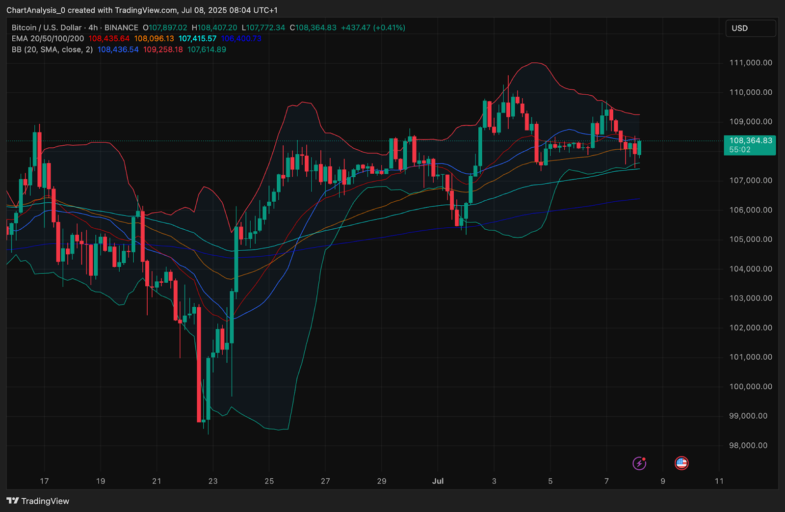 Technology supports breakout scenarios as momentum resets just below resistance. In the 4-hour time frame, Bitcoin price action shows stable grinding above 100 EMA ($107,415) and 200 EMA ($106,400). The Short Term 20/50 EMA offers immediate support around $108,000-$108,400, creating bullish clusters.