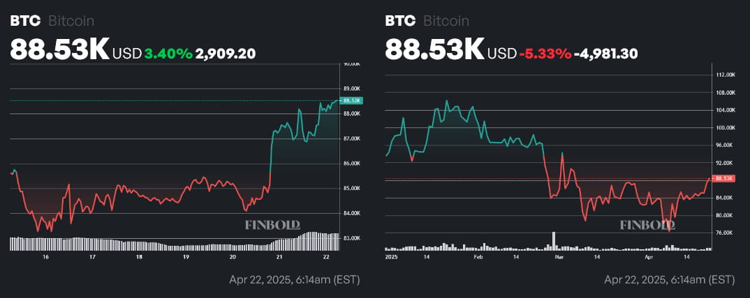 Bitcoin (BTC) surged from $85,000 to $87,000 during closing time on Sunday, April 20th. By press time on April 22nd, major cryptocurrencies had changed hands at a price of $88,530. It marked a profit of 3.40% on the weekly chart, which reduced its weekly (YTD) loss to 5.33%.