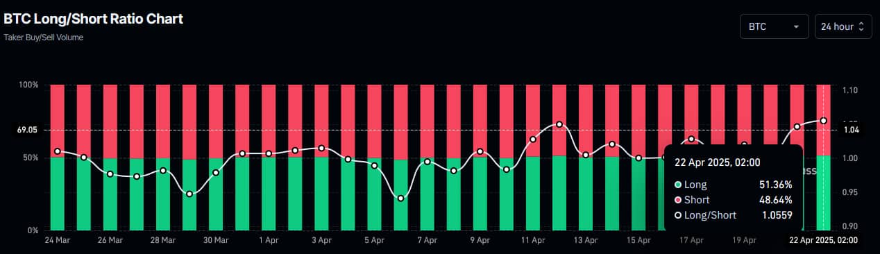 The second Bitcoin long/short ratio in the last 30 days was 1.05, which was seen on April 12, which represents 51.23% of the position. At the time, flagship digital assets were trading at $82,944.