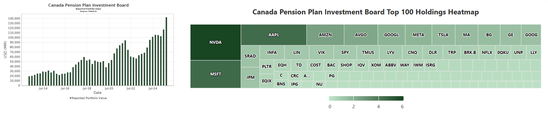 Canada Pension Plan Investment Board (CPPIB) disclosed a total of 1,346 holdings in its latest SEC filing. The latest portfolio value is calculated as USD 142,419,517,113. Actual assets under management (AUM) is this amount plus cash (undisclosed).