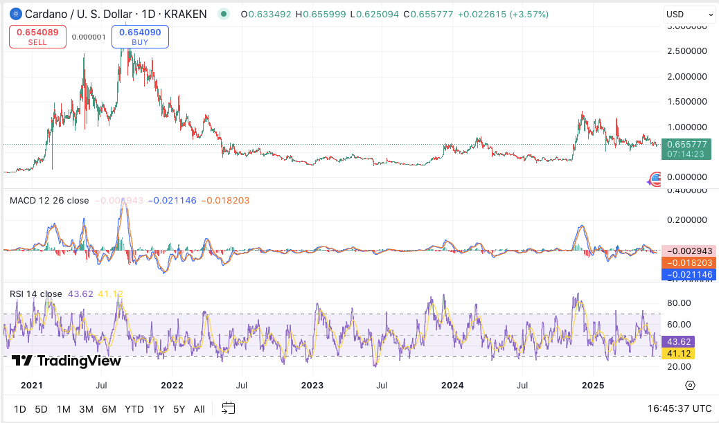 Currently, the ADA price is around $0.6549, reflecting a 3.95% increase over 24 hours. Trading volume also rose 42.13%, showing bullish interest.