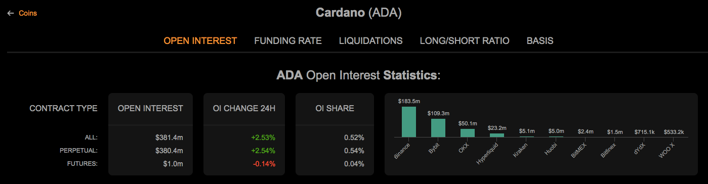 Meanwhile, ADA's public interest increased 2.61% to $380 million. Binance leads with the highest exposure, followed by Bybit and OKX.