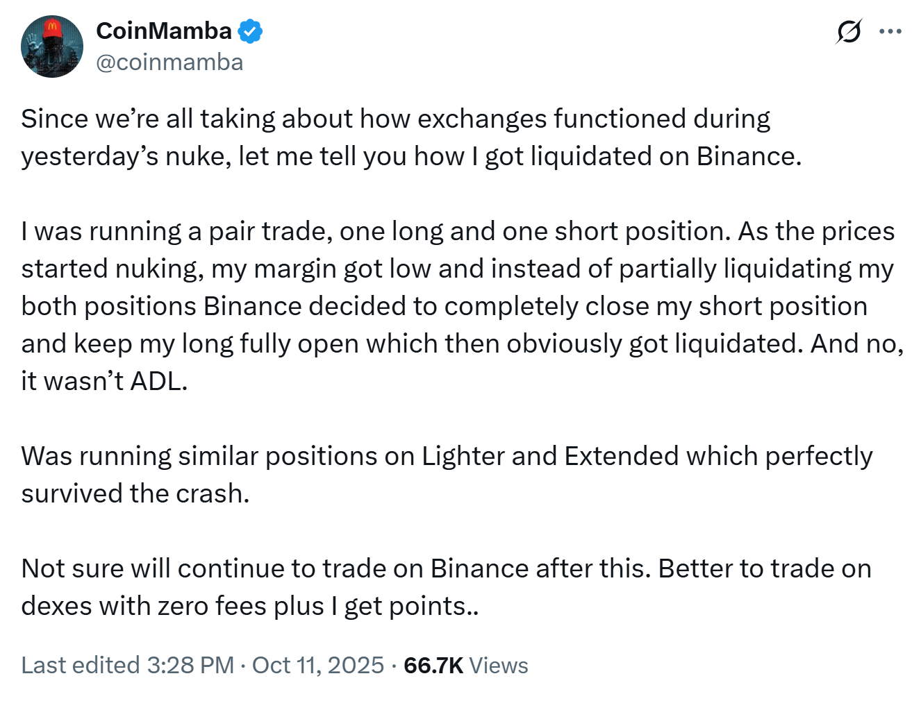 The announcement comes after some users reported losses due to platform errors. One Binance trader claimed that the exchange completely closed out his short positions while leaving his long positions open, leading to a total loss. The user said the issue was not related to automatic deleveraging (ADL) and pointed out that similar trades had survived the crash on other platforms such as Lighter and Extended.