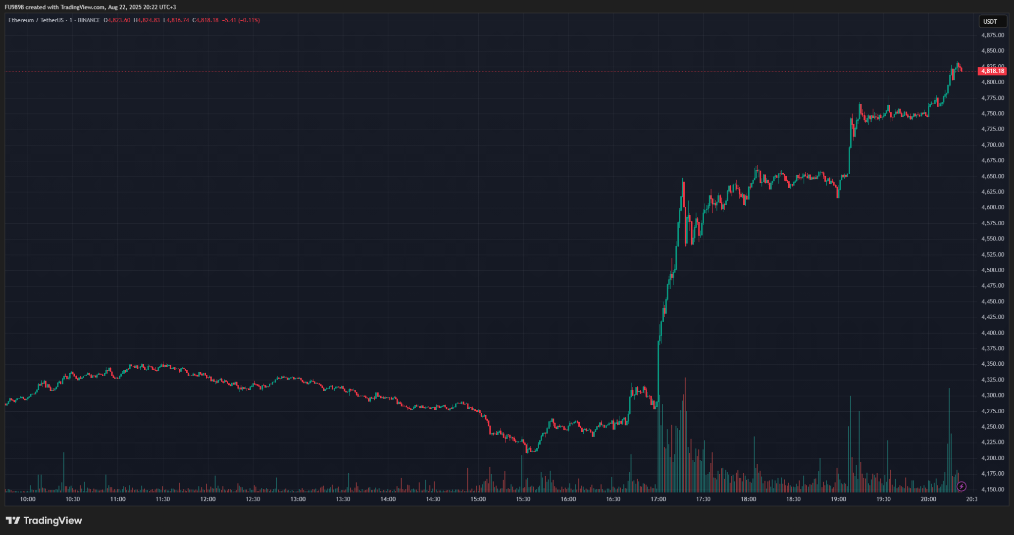 A chart with fine candles showing recent rise in ETH prices.