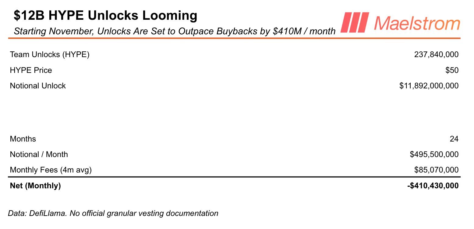 Hyperliquid's native tokens could still face a “Damocles Sword” moment in the biggest test, with $500 million worth of monthly unlock set to begin on November 29th, according to a study by Bitmex co-founder Arthur Hayes' Family Office Fund, Maelstrom.