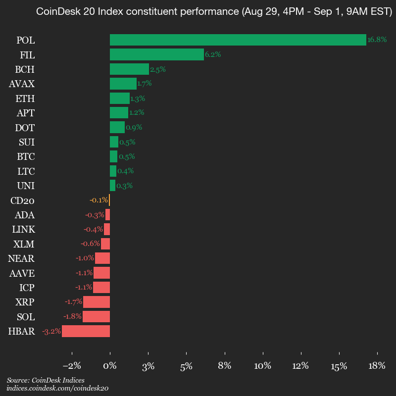 Native tokens for Ethereum scaling network Polygon (POL) led profits throughout the weekend with the extensive Crypto benchmark Coindesk 20 index.