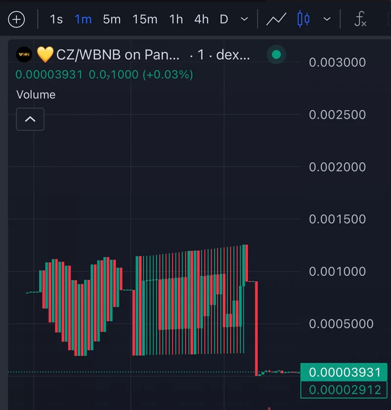 Price movement manipulation and heart emoji and CZ names created a token graph.